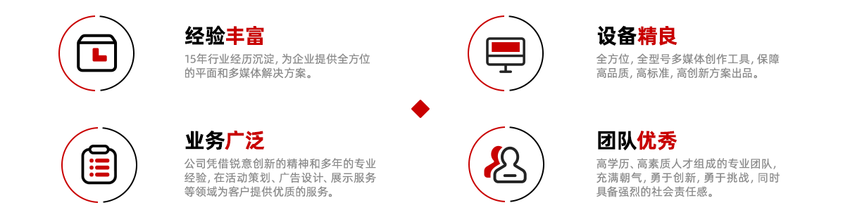 憑借銳意創(chuàng)新的精神和多年的專業(yè)經(jīng)驗,在活動策劃、廣告設計、展示服務等領域為客戶提供優(yōu)質(zhì)的服務。